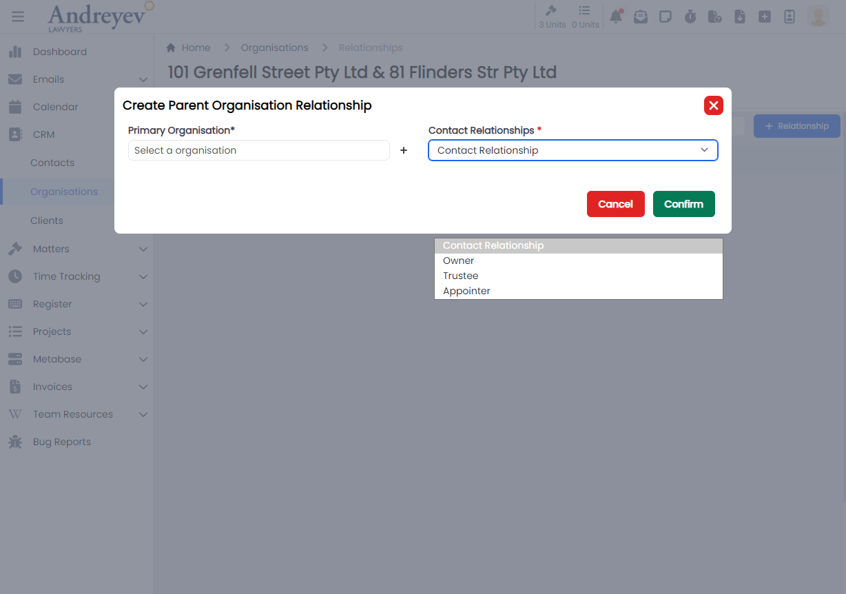 This component renders a modal using modalform, for creating a new organisation relationship.