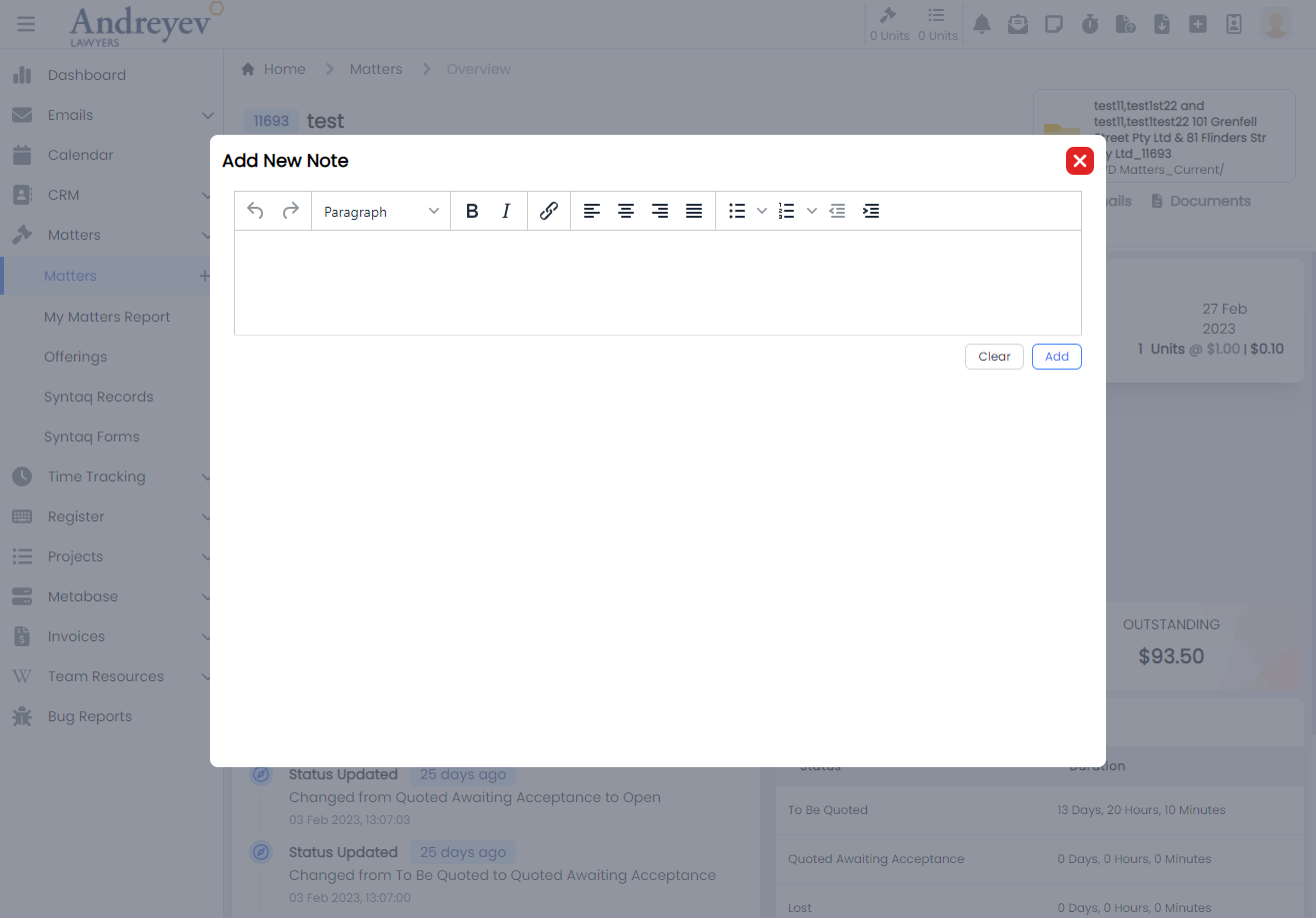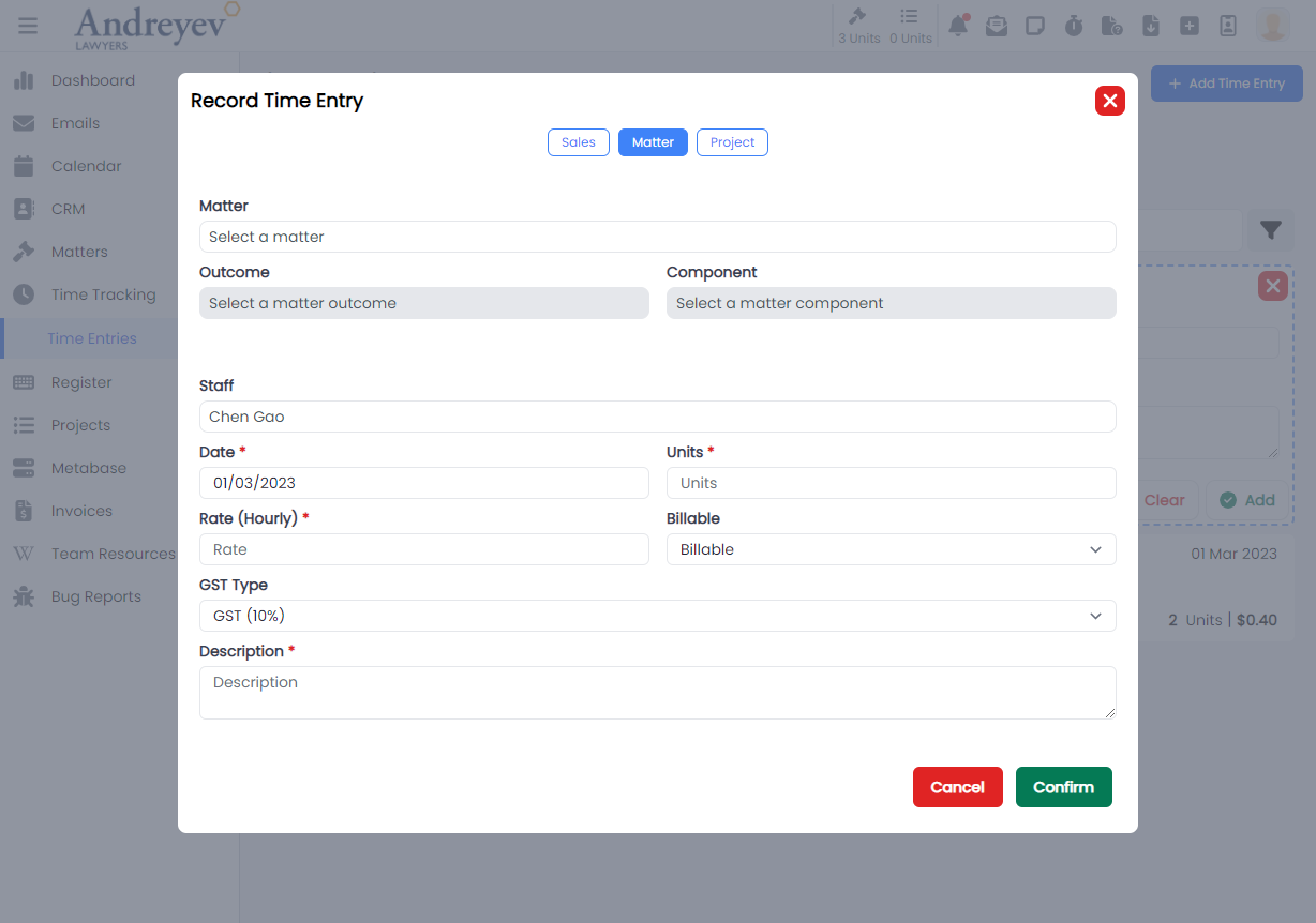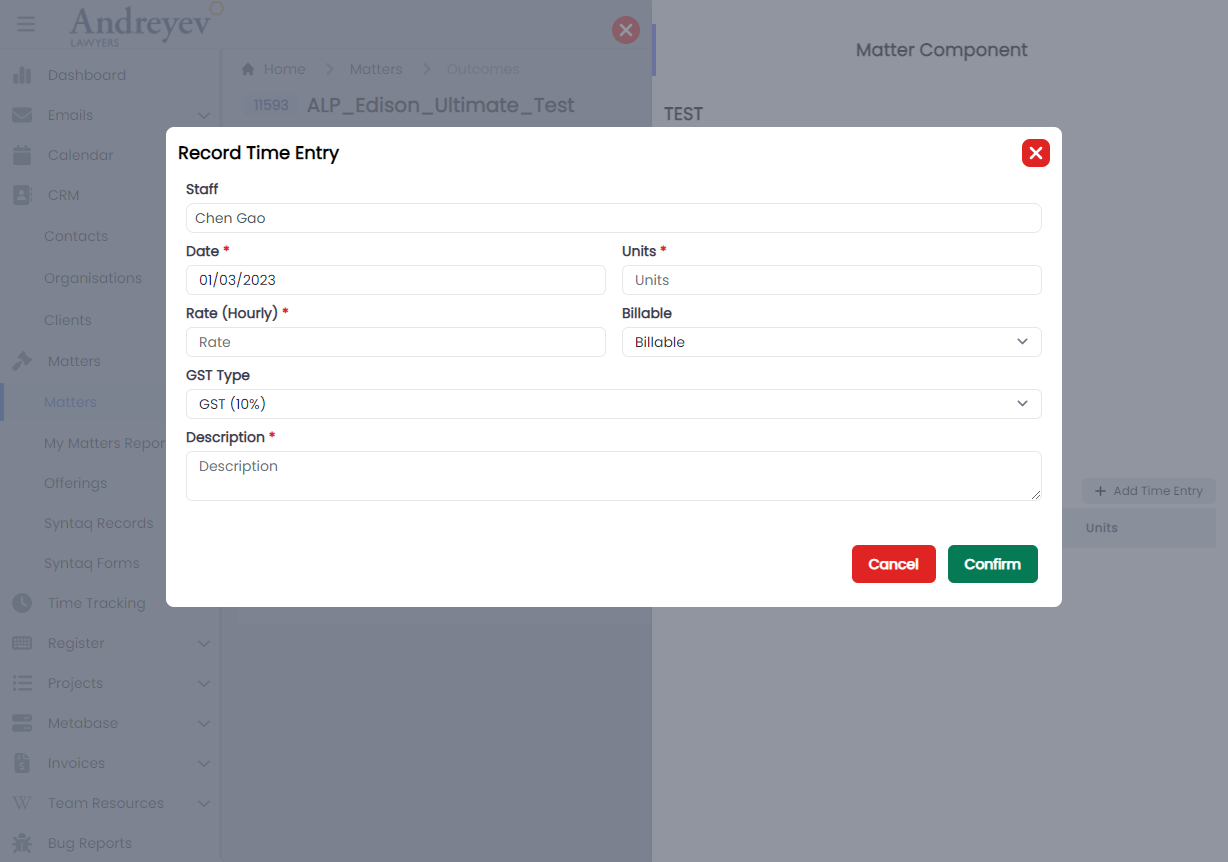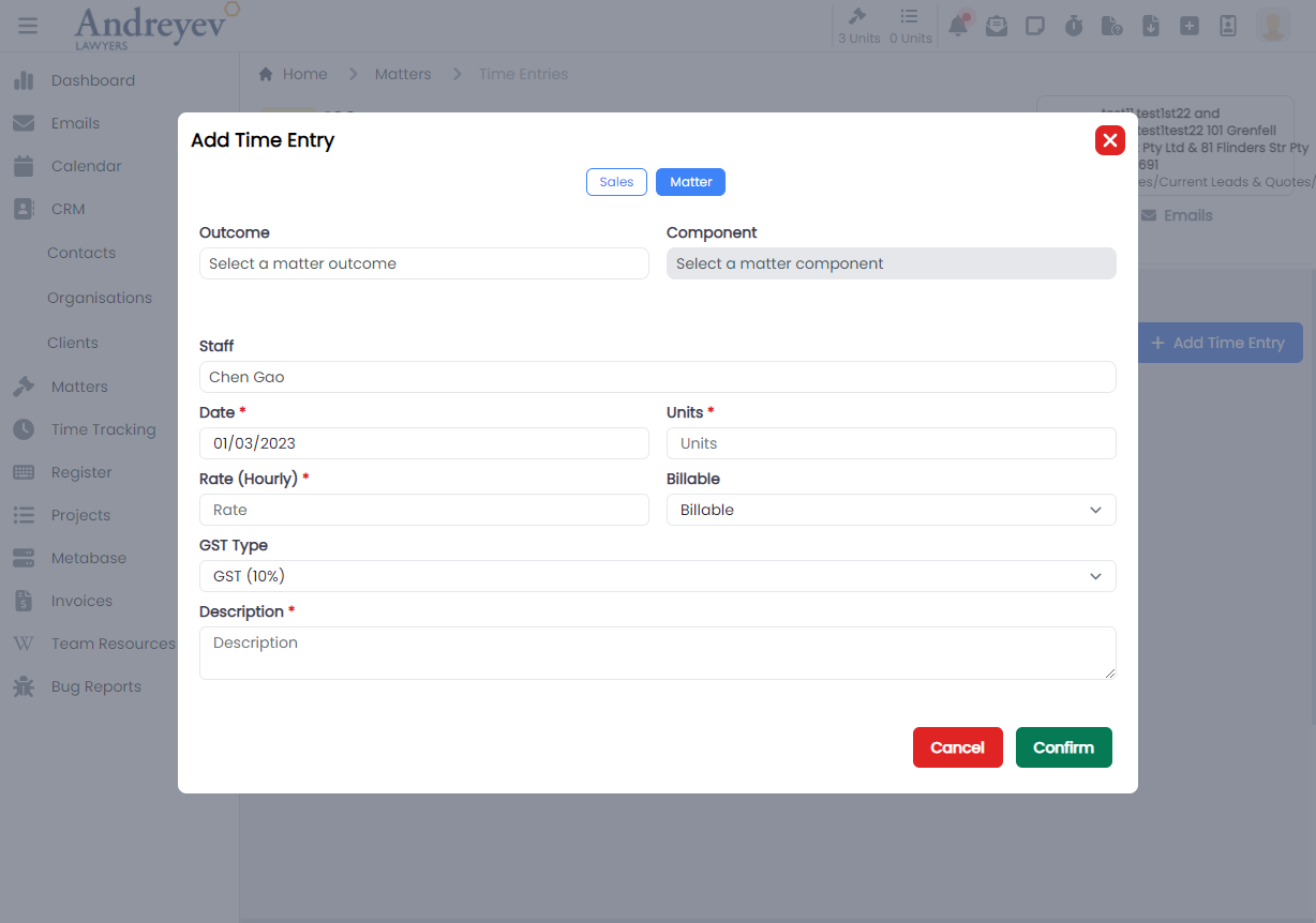 This is a component calling CreateTimeEntryFormForMatter into a modal to customise for creating a new time entry for matter as well as for sales.