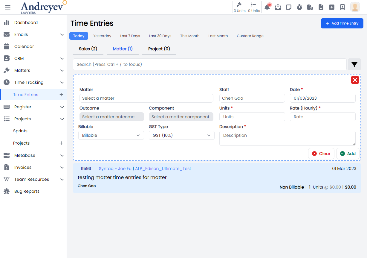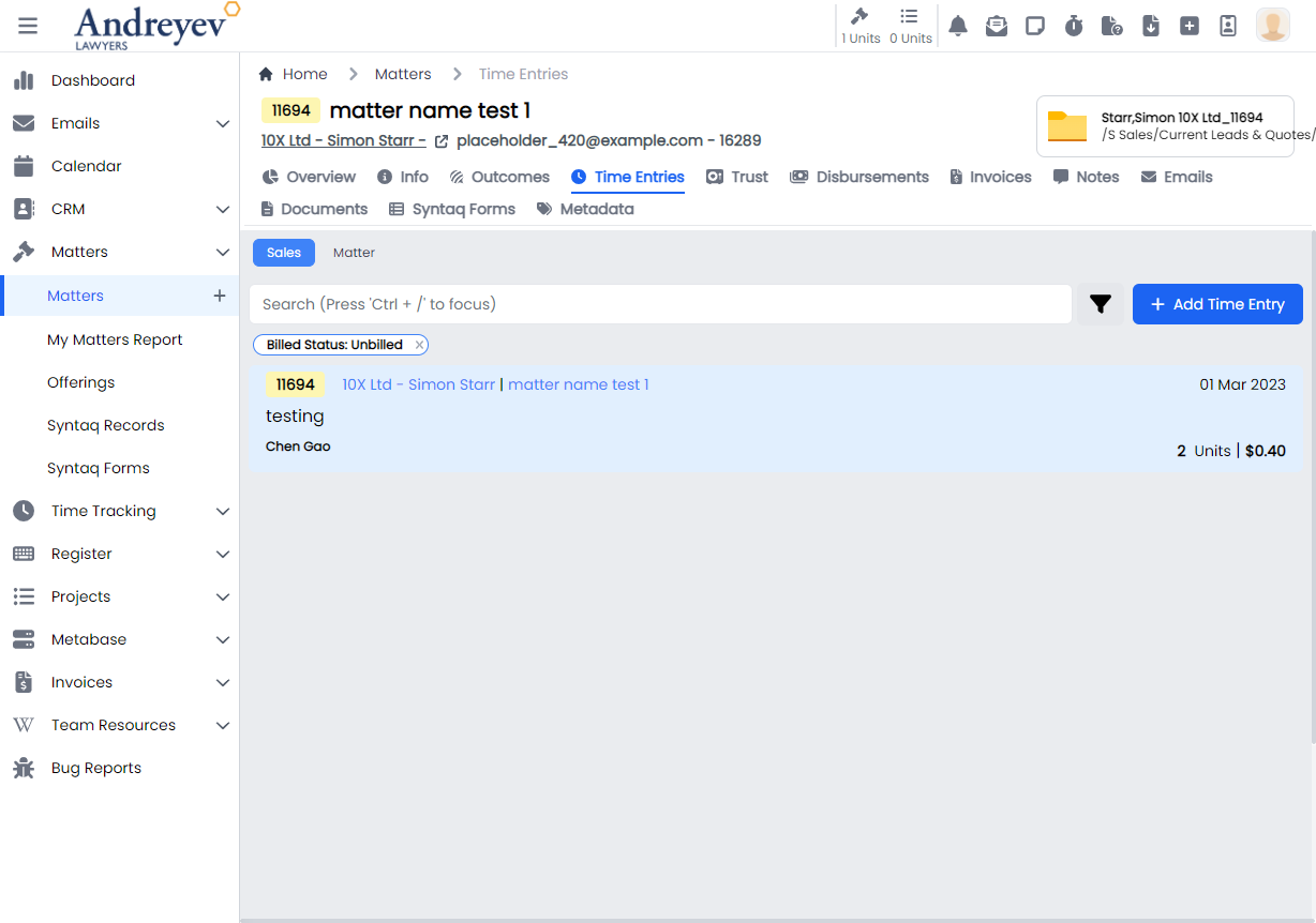This component renders each inline matter time entries under "Time Tracking" > "Time Entries" > "Sales" section.