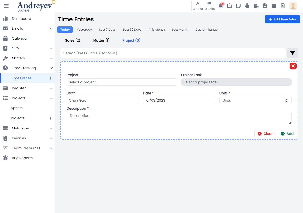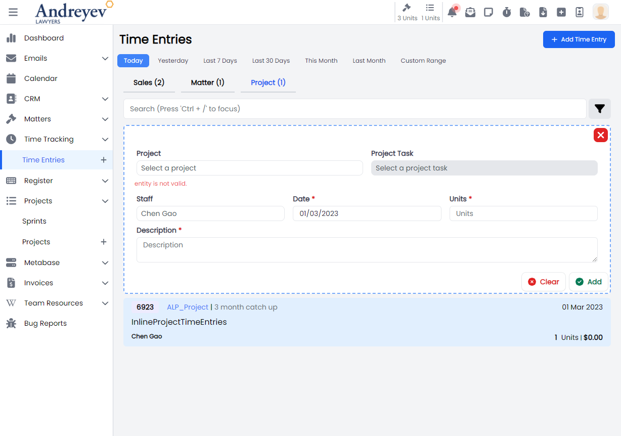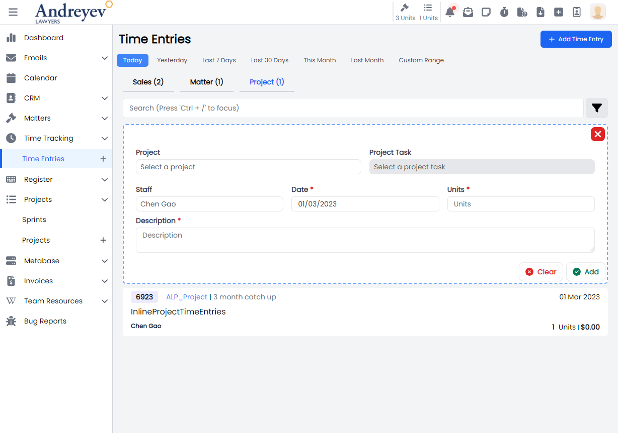 This component renders a inline adding of time entry for sales. This component is under "Time Tracking" > "Time Entries" section. It adopts the inline creating instead of the modal in the CreateTimeEntryForMatter.